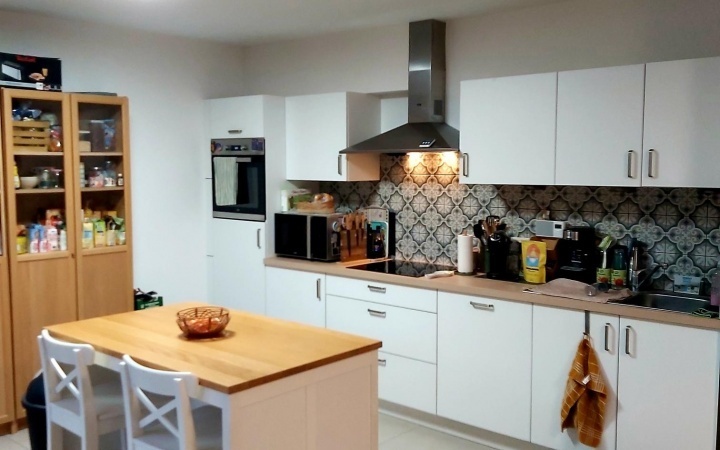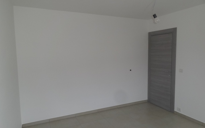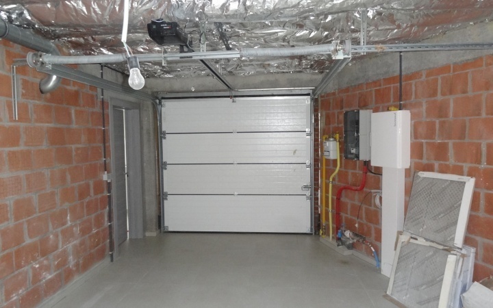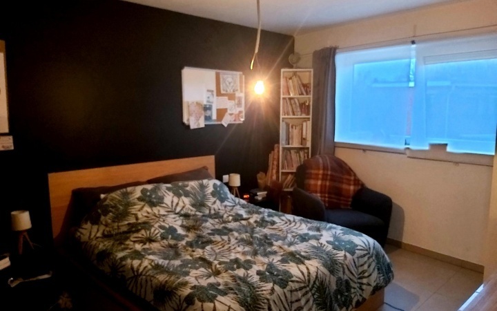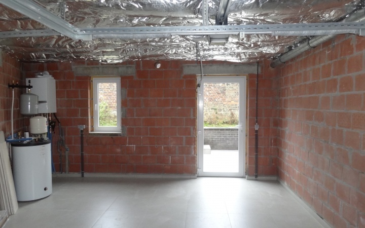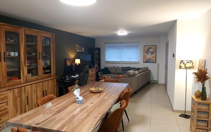 - au rez : hall d'entrée, living avec cuisine équipée, buanderie et wc. Terrasse et jardinet. Garage/chaufferie.